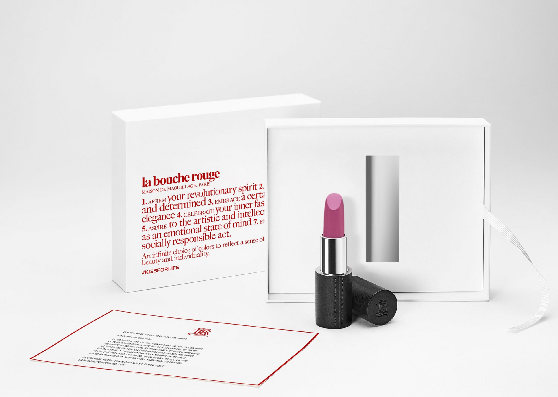 A lipstick is composed of a refillable lipstick case and an eco-refill. The lipstick formula is vegan, cruelty-free and without beeswax. It does not include petroleum derivatives nor silicone.