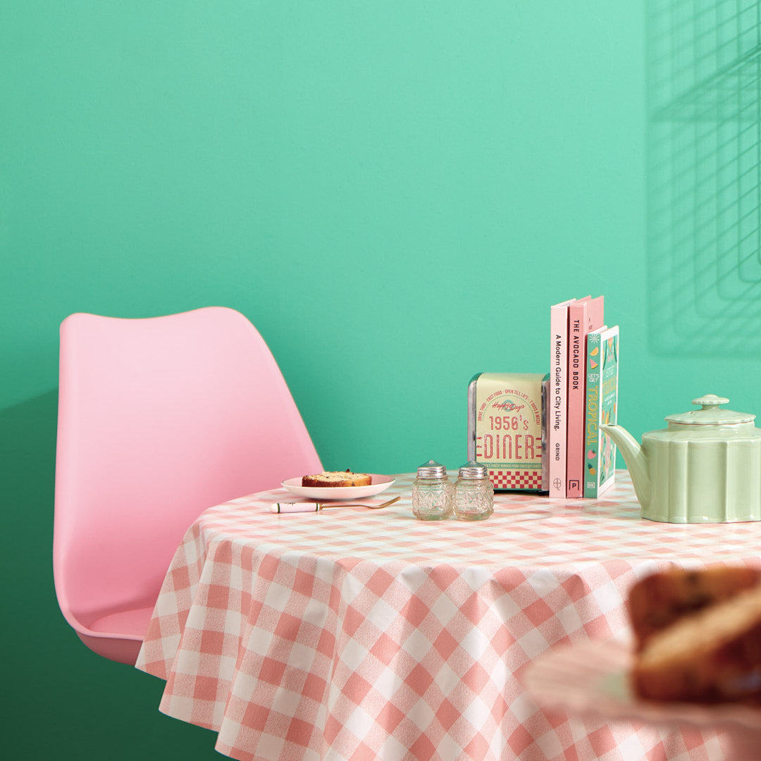 A deep, minty green with tones of turquoise, our green paint is made to uplift any room. For that Californian bungalow style, complement this refreshing mint green paint with candy pinks, navy blues and stripes.