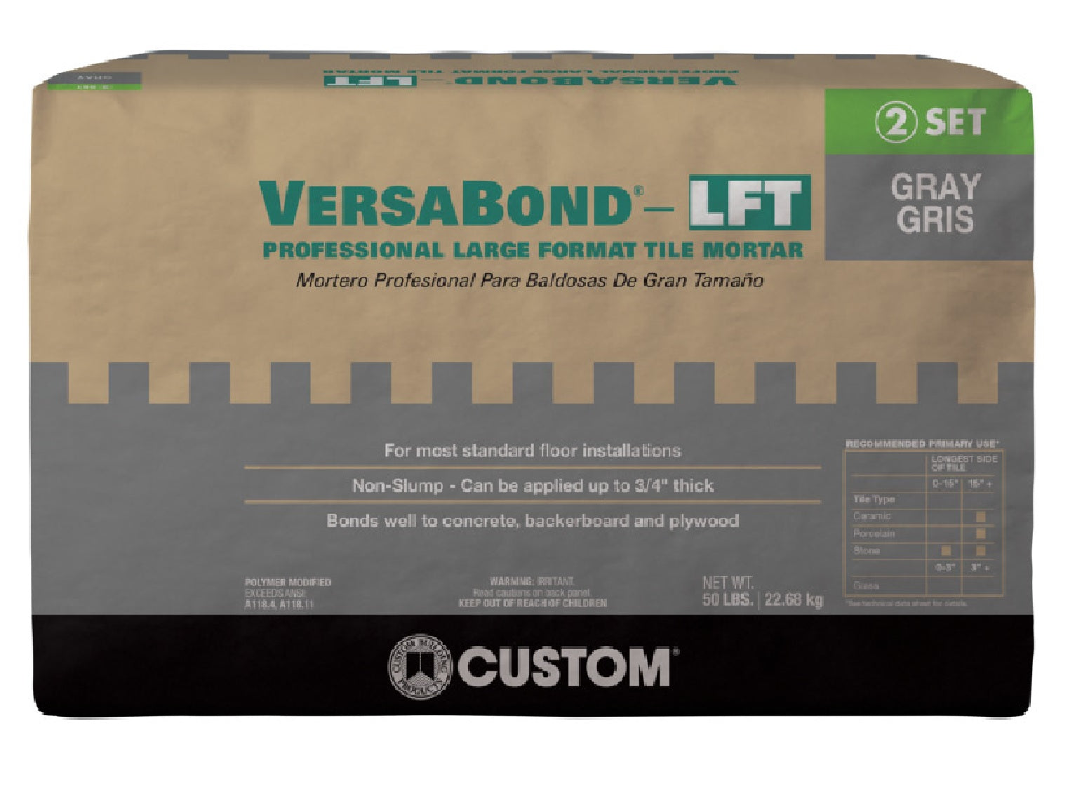VersaBond-LFT Fortified Medium Bed Mortar is a general purpose, economical, polymer-modified medium bed mortar for use with large format porcelain, ceramic and natural stone tile.