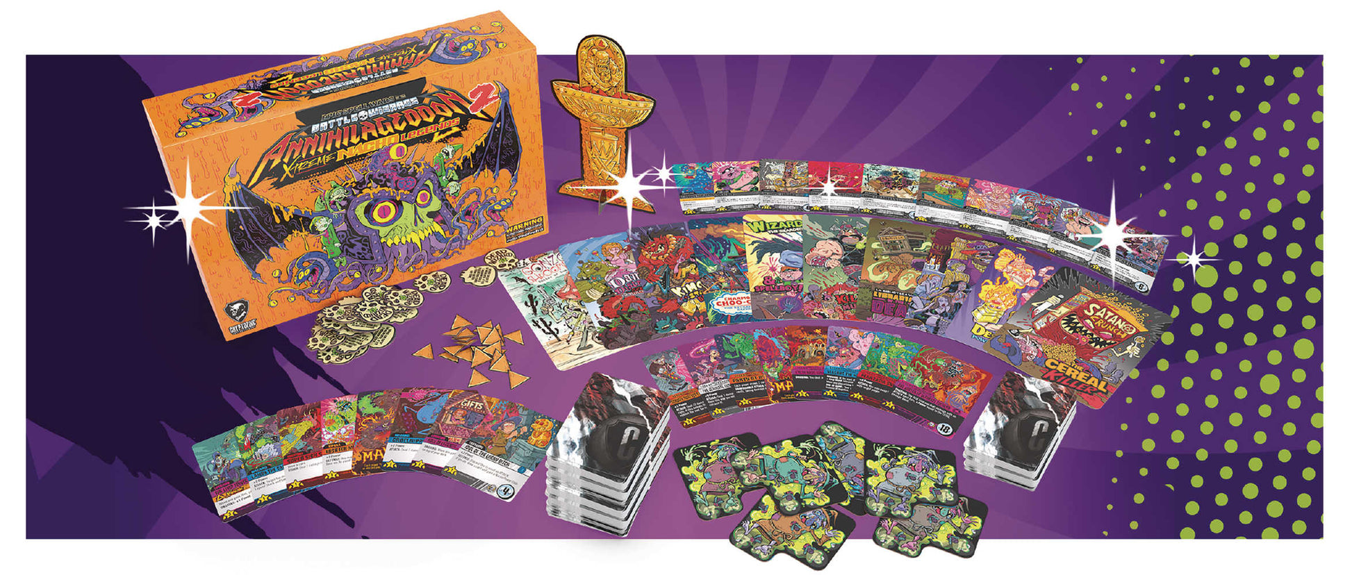 This replaces the regular cardboard standee in Epic Spell Wars: ANNIHILAGEDDON 2. This gold colored 11-inch plastic trophy holds plastic Xtreme Nacho Power Chips.