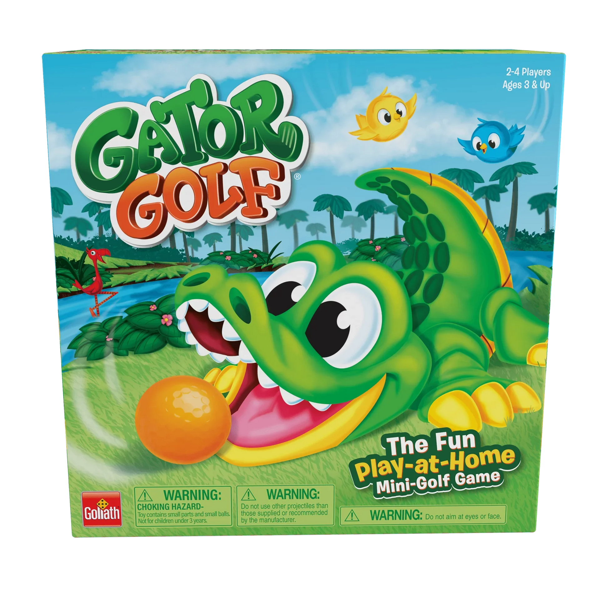 A hole-in-one is a lot more fun with Gator Golf! Grab your flamingo golf club, and aim to feed this hungry little Gator. Sink your putt by hitting your ball through the Gator’s mouth into his tail to score, but watch out – he’ll flick your ball with his tail for more putting action. The first player to score 3 points wins! Fun, active gameplay gets kids up and moving while developing large motor skills and hand-eye coordination. Cute birds on the Gator’s back serve as built-in score keepers. Gator Golf plays best indoors on low-pile carpet. For 2-4 players, ages 3 and up.